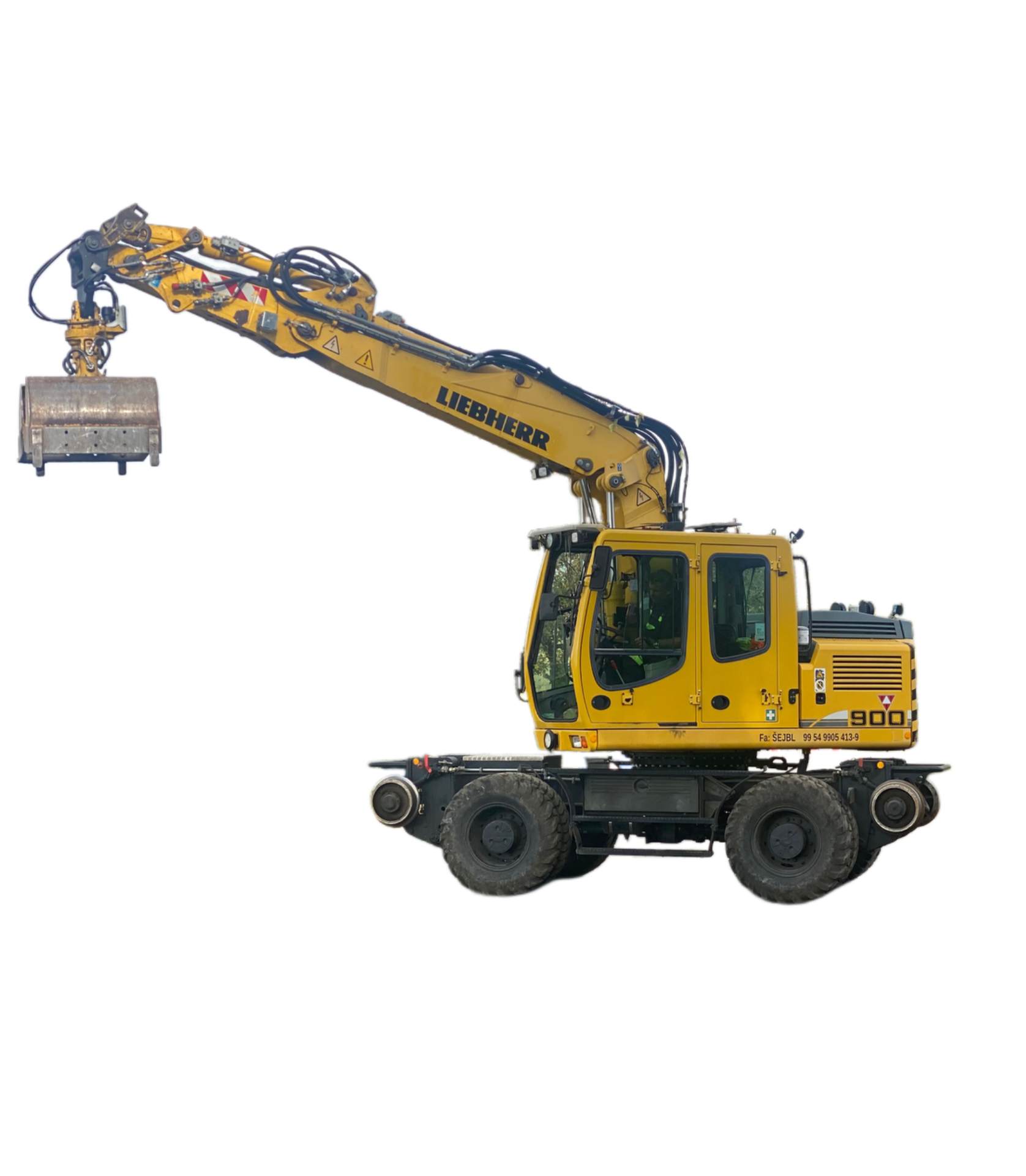 - Příslušenství: Tiltrotátor SMP, svahová lžíce, bagrovací lžíce, paletizační vidle, lžícový drapák, mezipražcový drapák, kleště na koleje